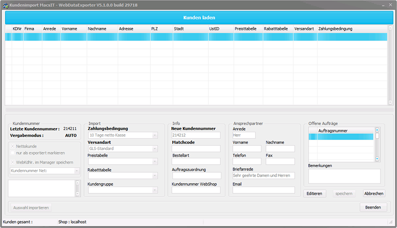 Beim Import wird festegetellt ob der Kunde schon Aufträge im Webshop hat. Sollte es Aufträge geben, was wahrscheinlich ist, niemand legt ein Kundenkonto zum Spass an, dann können Sie festlegen welche der bestehenden Aufträge in MANAGER übernommen werden sollen. Auch solche banalen Dinge wie abweichende Kundennummern im Shop und im Warenwirtschaftssystem werden berücksichtigt und automatisch an beiden Stellen angepasst.