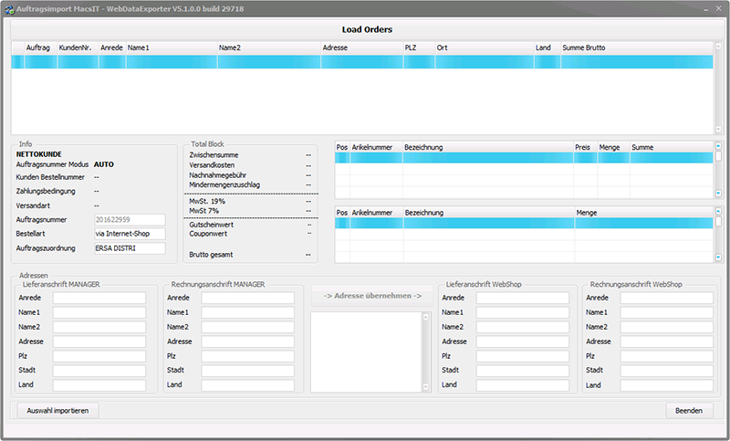 Aber das war es wert. Es können nun Aufträge aus dem Shop, per Buttonclick, direkt ins Warenwitschaftssystem übernommen werden. Selbstverständlich sind Möglichkeiten vorhanden den Import noch kundenindividuell anzupassen bevor er übernommen wird.
